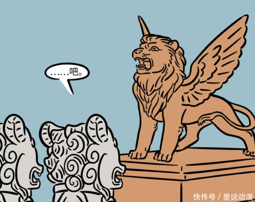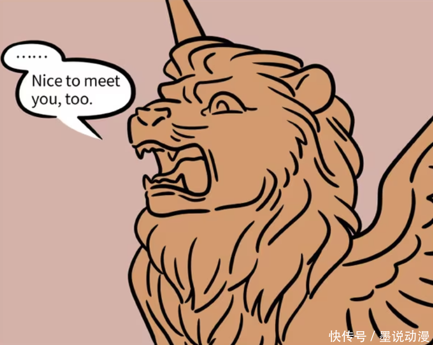 《非人哉》漫画版,第669话中,新石狮子出现。这只石狮子跟传统的石狮子不一样,带有一对翅膀,看起来还是铜制的。小刘误以为这只石狮子来自外国,所以用英文交流。结果新石狮子是来自河南,或许它们就会发现原来都是中国石狮子。