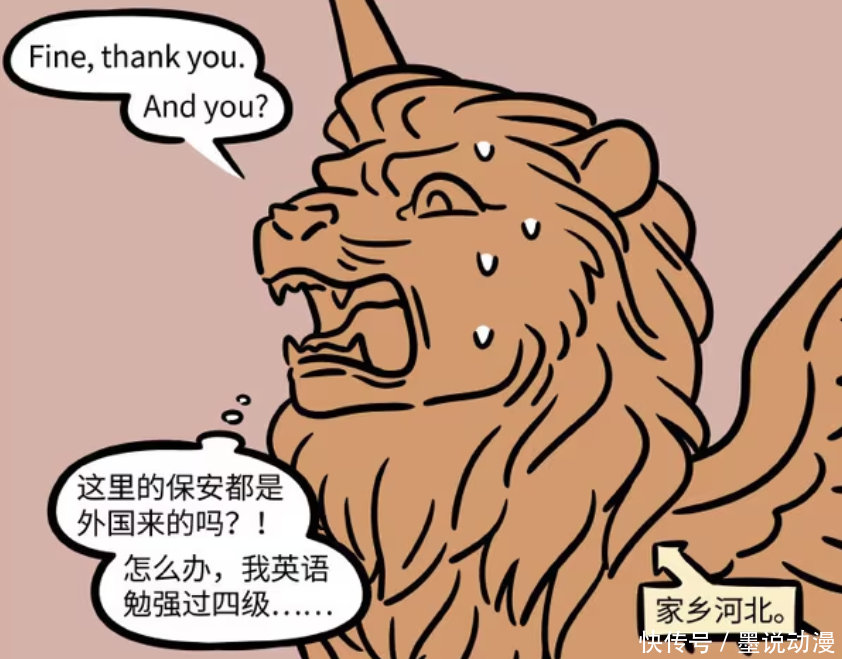 其实这只所谓的外国石狮子,其实并不是真正来自外国,只是造型像是外国产物。其实这只新石狮子是来自河北。此时新石狮子觉得,这里的保安都是外国来的吗?它的英语水平只有四级,不知道接下来该如何应对?不过后面说清楚,误会也就解除,沟通就没有任何障碍。